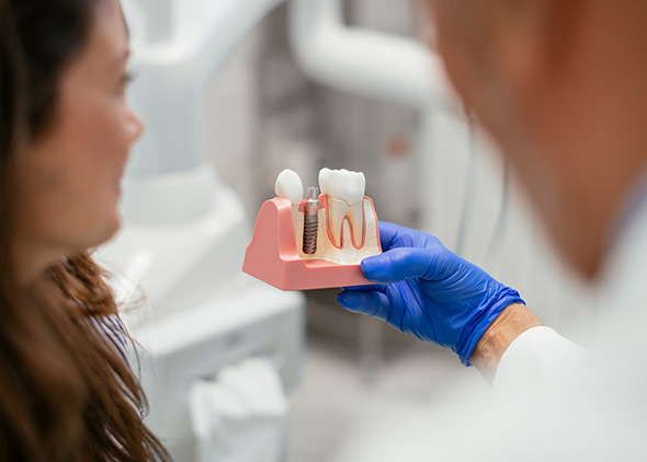 Dental implants replace missing tooth roots using small titanium posts placed into the jawbone. The titanium posts support custom restorations, resulting in a fixed, natural-looking outcome. Dental implants restore chewing ability, speech and smile appearance while supporting jawbone structure.
